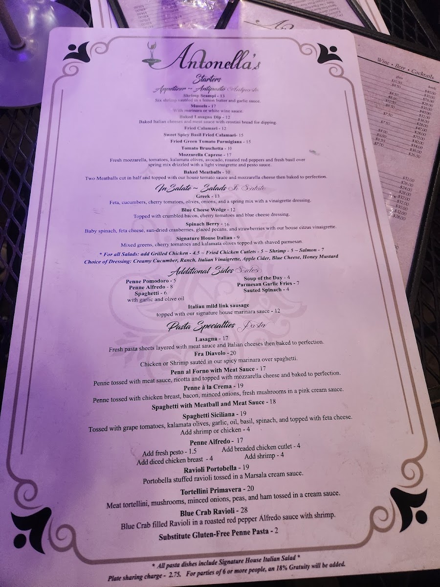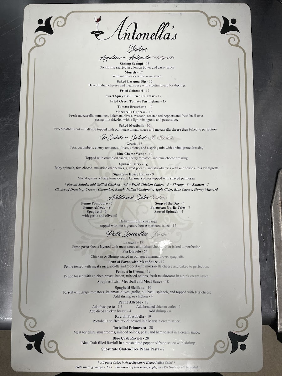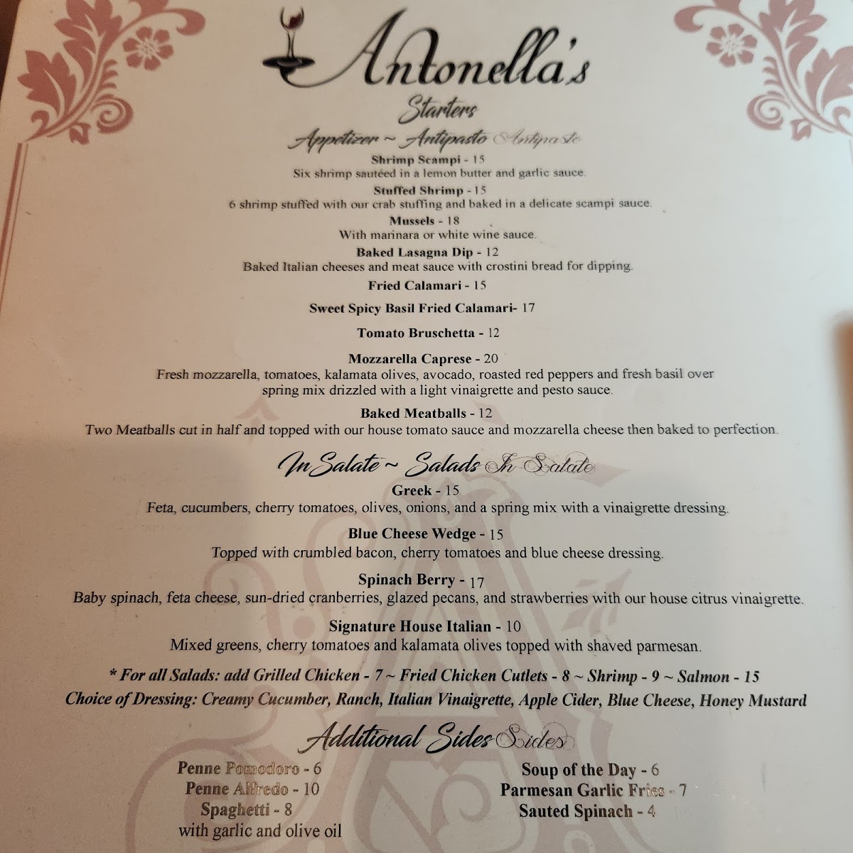 The menu at Antonella's Italian Ristorante offers a balanced blend of classic Italian dishes served in a warm, inviting setting. It features a range of thoughtfully prepared options from hearty pasta specialties like Lasagna and Tortellini Primavera to fresh, flavorful seafood such as Stuffed Lobster Ravioli and Frutti Di Mare. Alongside these, you’ll find satisfying sandwiches and Italian baguettes perfect for a casual lunch or a light dinner.