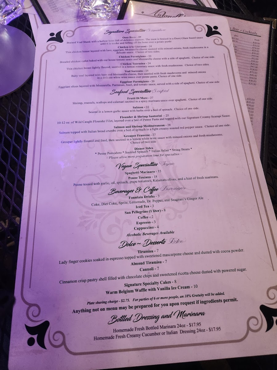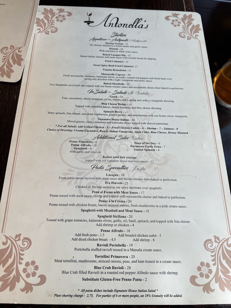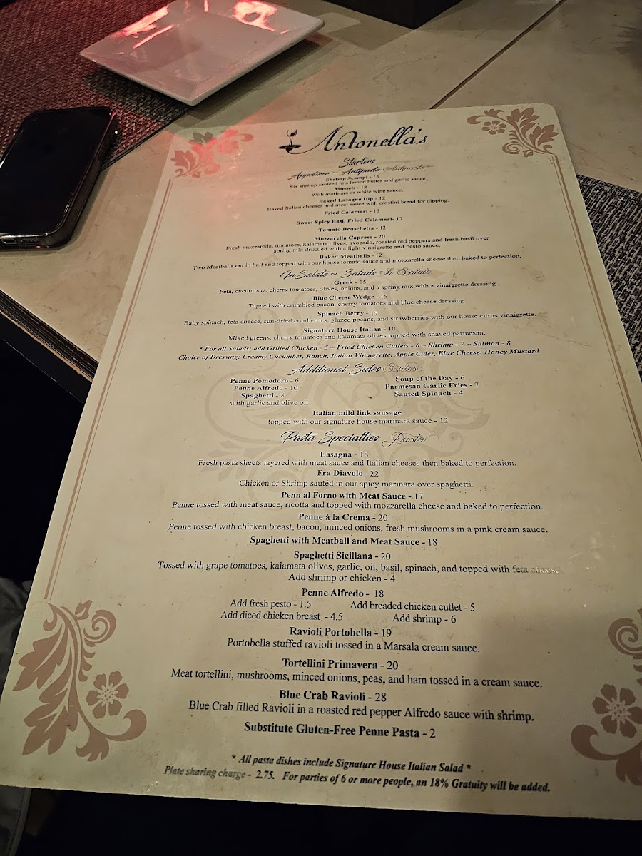 The menu at Antonella's Italian Ristorante offers a balanced blend of classic Italian dishes served in a warm, inviting setting. It features a range of thoughtfully prepared options from hearty pasta specialties like Lasagna and Tortellini Primavera to fresh, flavorful seafood such as Stuffed Lobster Ravioli and Frutti Di Mare. Alongside these, you’ll find satisfying sandwiches and Italian baguettes perfect for a casual lunch or a light dinner.